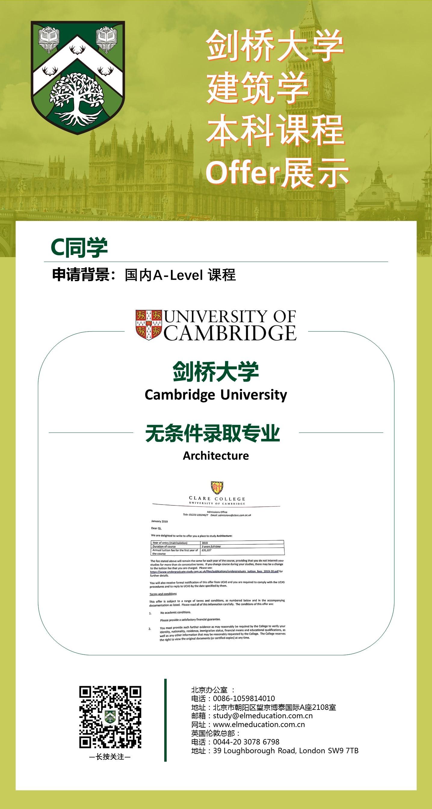 最后我们经过与家长和学生的多次沟通后,当时为学生提供了最稳妥的申请方案即以室内设计申请为主,同时申请建筑和工程专业。当年9月再次提交剑桥大学建筑专业的申请。