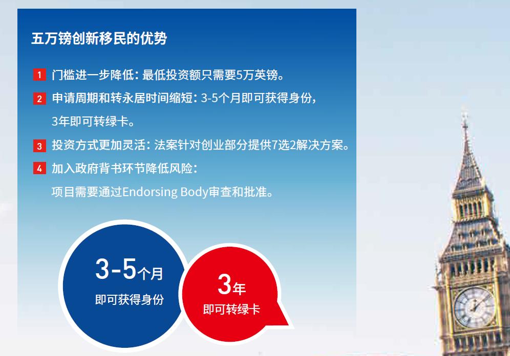 创新签证是英国政府于2019年3月正式设立的一种商业移民签证,旨在鼓励、吸引海外有经商经验的人士来英国建设、拓展事业。英国政府对此类签证的投资款额要求仅为5万英镑,获签后便颁发3年有效签证,之后在满足相关移民条列的基础上,可直接转永居。