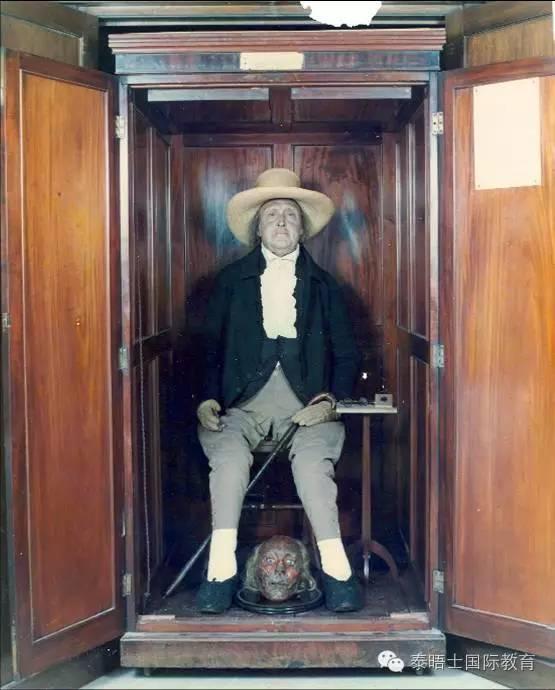 边沁死后,UCL把他的尸体制成木乃伊永久保存。全身除了头部,全部是他的真身。他的头去了哪里?有传说他的头被死敌国王学院的学生们偷走后当球踢了,有传说制作木乃伊过程中头部没有处理好废了,也有传说他的头现在放在考古学院。反正现在他的头部被蜡像代替,与身体其余部分吻合,被供奉在一个带轮子的特制木框里。