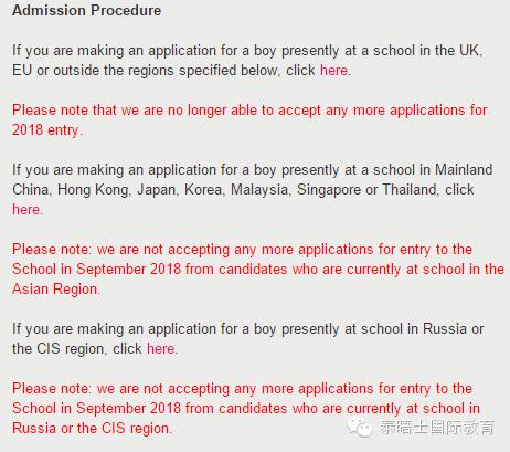 英国和欧盟学生想要申请该校要在男孩子八岁以后,十岁之前进行注册登记,13岁入学,注册费两百磅。这些地区的学生家长通常会来学校参观,然后在男孩9岁到10岁这段时间选定宿舍,也就是house,但亚洲国家的孩子没有要求必须选好宿舍。
